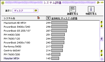 ノートン先生の出番です。 ノートン先生に測ってもらいました。 接続したマシンは会社の6100(G3/248MHz/264MB)です。 その結果は、、 うみゅ〜モンスター君、情けないぞ!! 何故にそんなに遅いのか、、、 ちなみにMacintosh HDというのは、6100に標準でついてくる内蔵350MBディスクです。 G3にしてありますが、標準品(?)でも結構速いものですねぇ。 |